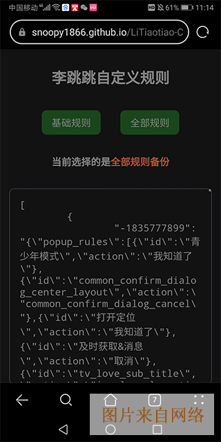 当然如果用户可以在手机浏览器上打开这个链接地址:https://snoopy1866.github.io/LiTiaotiao-Custom-Rules/,那就可以直接复制代码,然后打开李跳跳app将规则导入进去即可,如果没有显示出来可以点击全部代码,稍等下就会出来代码文本了。