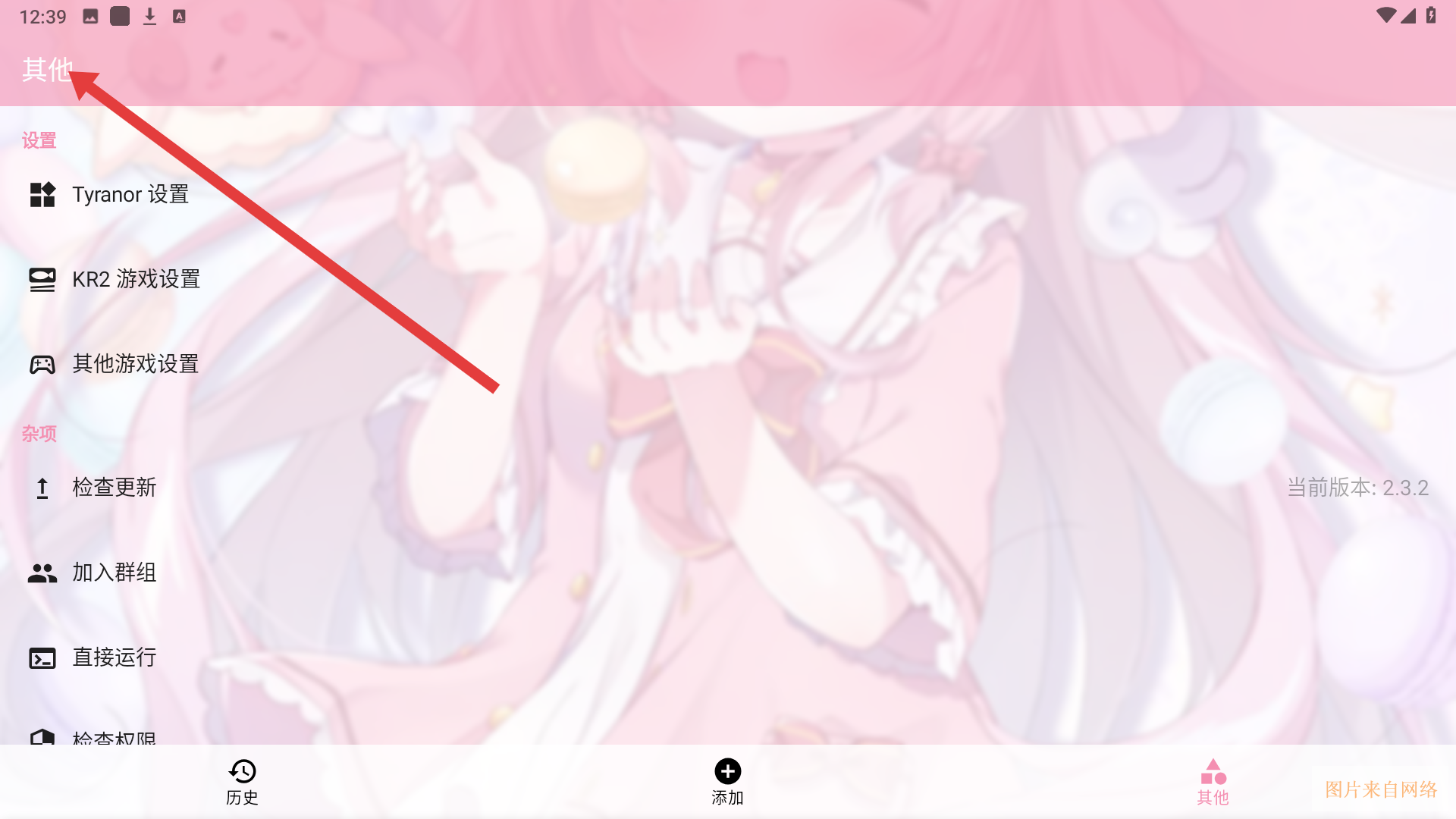 4、点击其他板块,可进入设置界面,查看Tyranor设置、KR2游戏设置等,还可进行检查更新、加入群组等操作,提升应用使用体验。