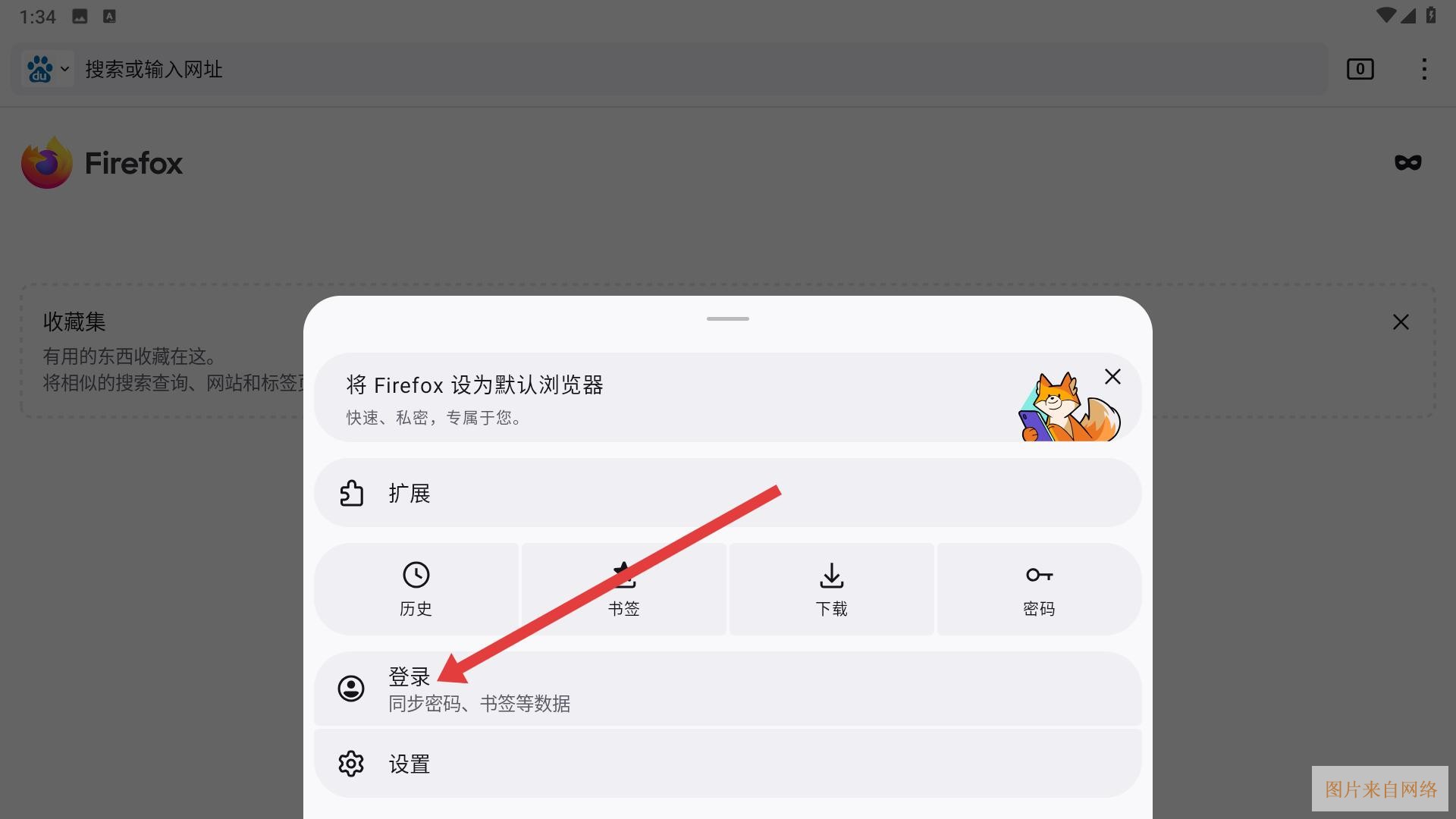 2、弹出的菜单中,找到登录选项并点击,该选项可实现密码、书签等数据的同步。