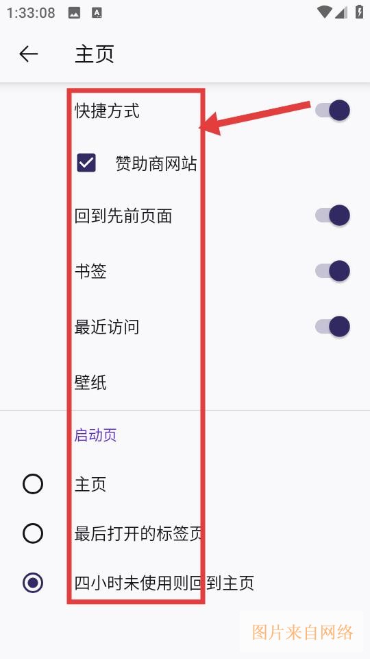 2、定制主页界面设有快捷方式、书签、最近访问等功能开关,还提供启动页选项,从默认主页到最后打开标签页,再到闲置回归主页,灵活适配用户使用习惯。