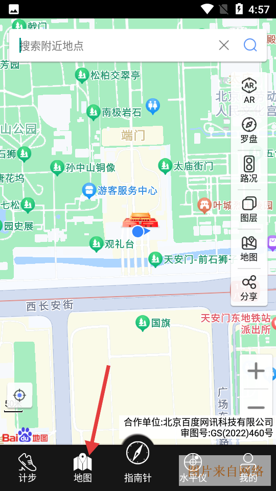2、地图功能页面可搜索附近地点,以北京区域为例,标注诸多景点与设施,由百度网讯科技合作支持。