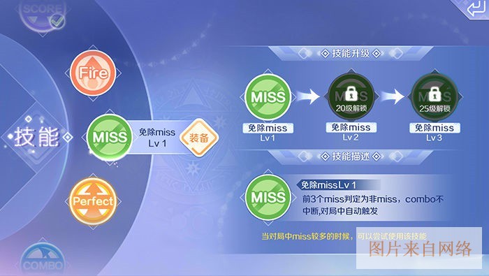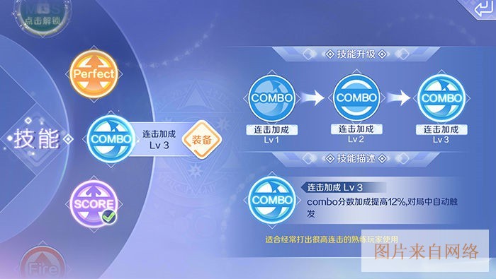 提高歌曲音符COMBO得分,比较适合可以达成歌曲ALL COMBO评价的玩家选择,这个技能最忌讳连续出现MISS,这样会损失很多的得分加成。在对当面模式比较熟悉,并且对歌曲旋律、音符熟悉的情况下,这个技能会比较实用。