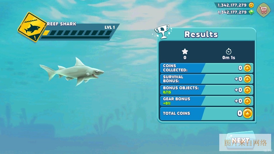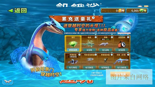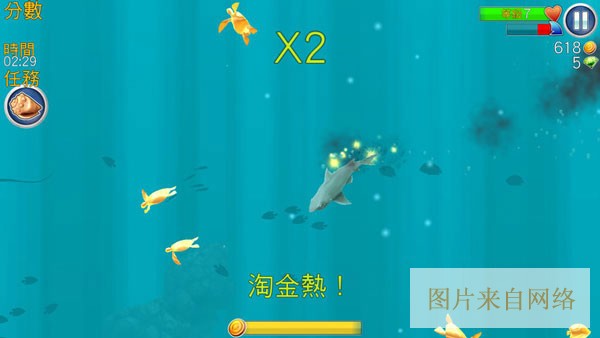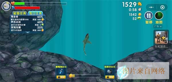 4、完成50个任务,寻找宝物取得金币与宝石,用来升级你的鲨鱼或者购买特殊救生道具。