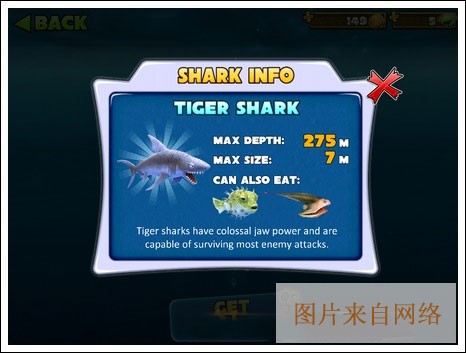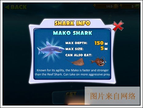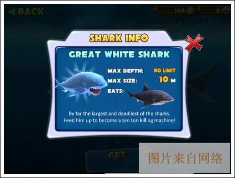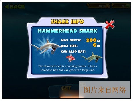 5、逐渐解锁更多水下凶猛野兽:灰鲭鲨、锤头鲨、虎鲨和无敌的大白鲨!