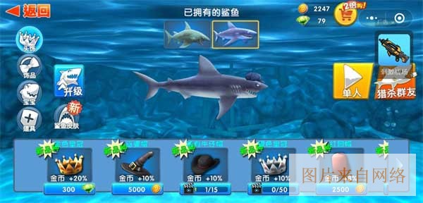 3、丰富的升级内容,可以通过升级强化提升鲨鱼的狩猎能力和生存能力。