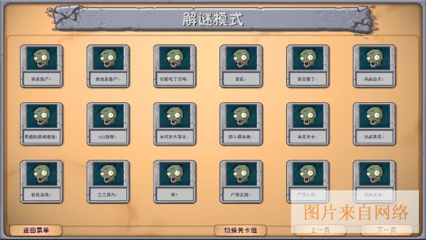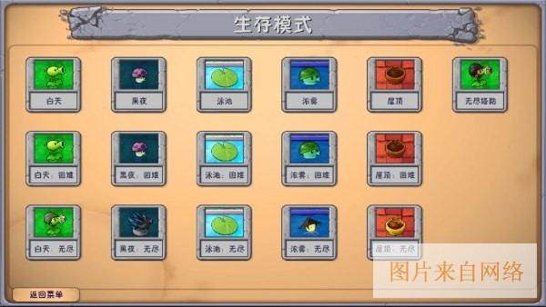 包括白天/黑夜/泳池,迷雾/屋顶的普通和困难关卡,泳池无尽,塔防无尽。
