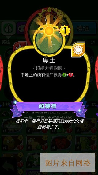 焦土:平地上的僵尸获-1/1,植物版酸雨,疯狂克星,打出后疯狂的僵尸基本上非死即残,不是疯狂僵尸的话也有削弱的效果。