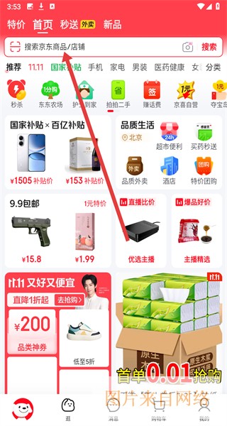 1、在京东APP首页点击顶部搜索栏,可以进行搜索商品。