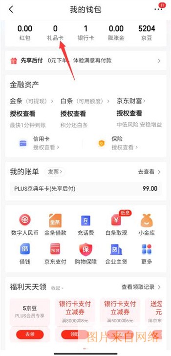 3、打开我的钱包后,在上方的功能列表中选择【礼品卡】;