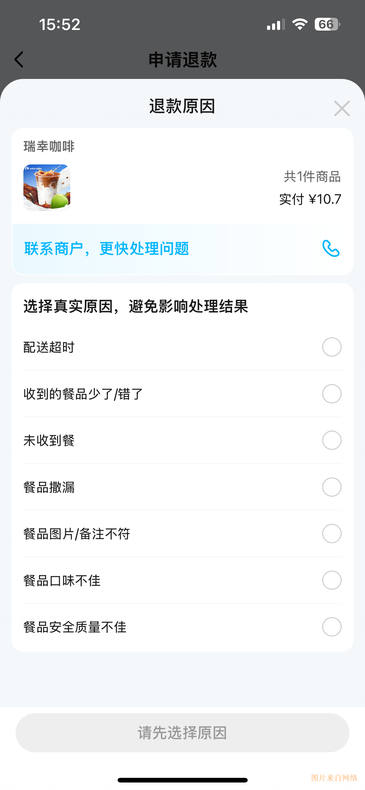3、在申请退款界面,根据实际情况选择退款原因,选择好原因后,按提示操作提交退款申请,等待商家和平台处理。