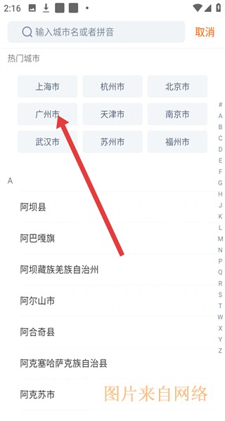 4、在进入到城市选择页面中,可以点击热门城市进行定位。