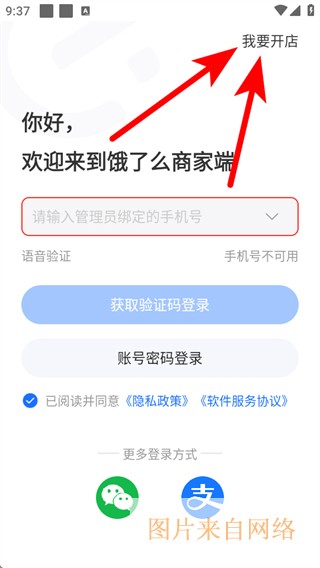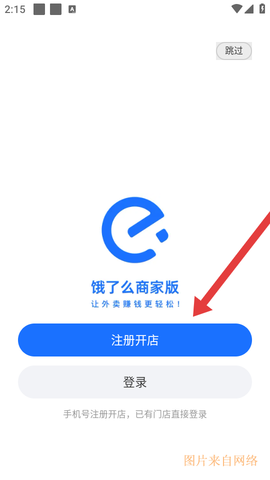 1、打开饿了么商家版APP,进入初始界面后,点击注册开店按钮,启动入驻流程,若已有门店,选择下方登录按钮,凭账号密码进入管理端。