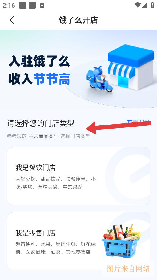 2、在饿了么开店页面,选择门店类型如餐饮门店、零售门店。