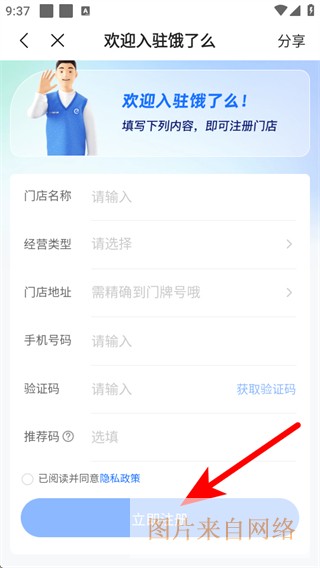 4、在页面填写门店名称等信息,点击立即注册,完成门店入驻操作。