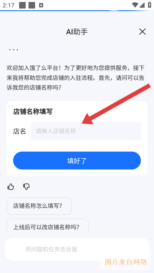 3、选定门店类型后,系统会唤起AI助手辅助入驻,助手首先询问店铺名称填写,在界面的店名输入框内,如实填写店铺名称。
