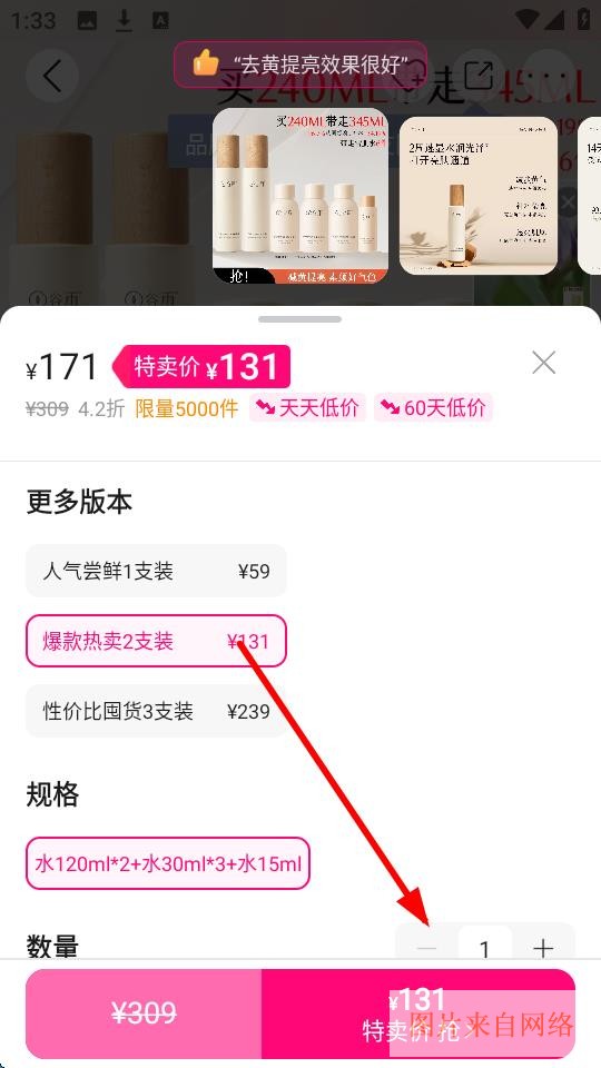3、在商品详情页下方【更多版本】处,选择如【爆款热卖2支装】等合适套装,确认【规格】(如水120ml*2+水30ml*3+水15ml)无误后,点击“+”“-”调整【数量】,再点击【特卖价-抢】,即可将商品添加至购物车。