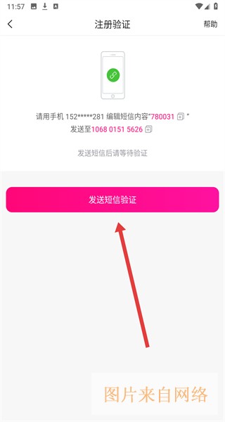 4、进入到注册验证页面时,点击发送短信验证按钮,进行验证操作后完成注册。