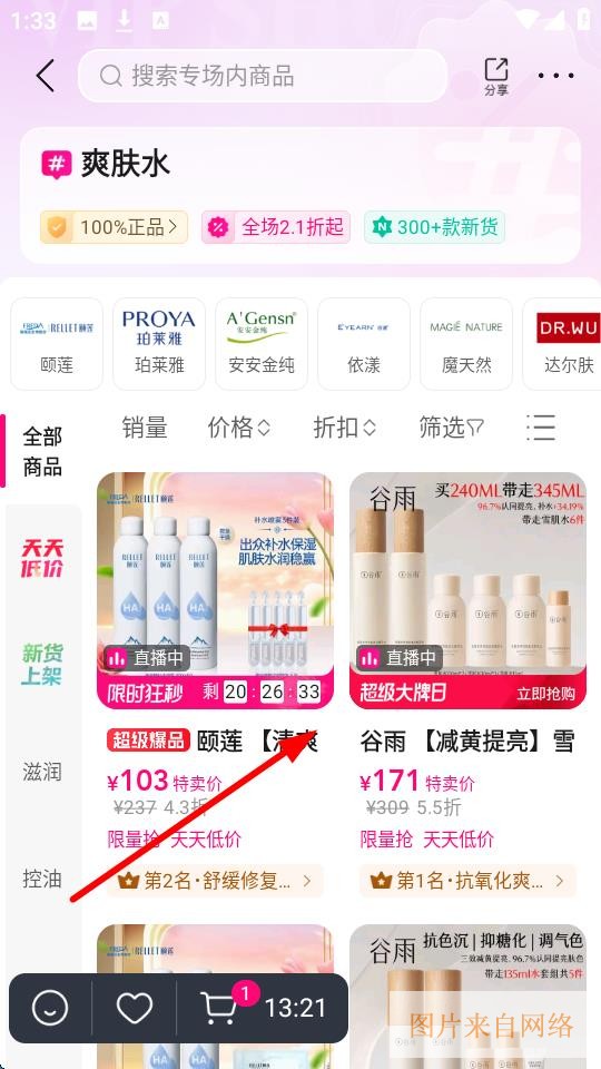 1、打开唯品会APP,进入【爽肤水】专场,在搜索框下方能看到“100%正品”“全场2.1折起”等标识。通过【全部商品】下方的【销量】【价格】【折扣】等筛选条件,快速定位目标商品,若商品处于【直播中】,留意【限时狂秒】倒计时,找到心仪商品后点击进入。