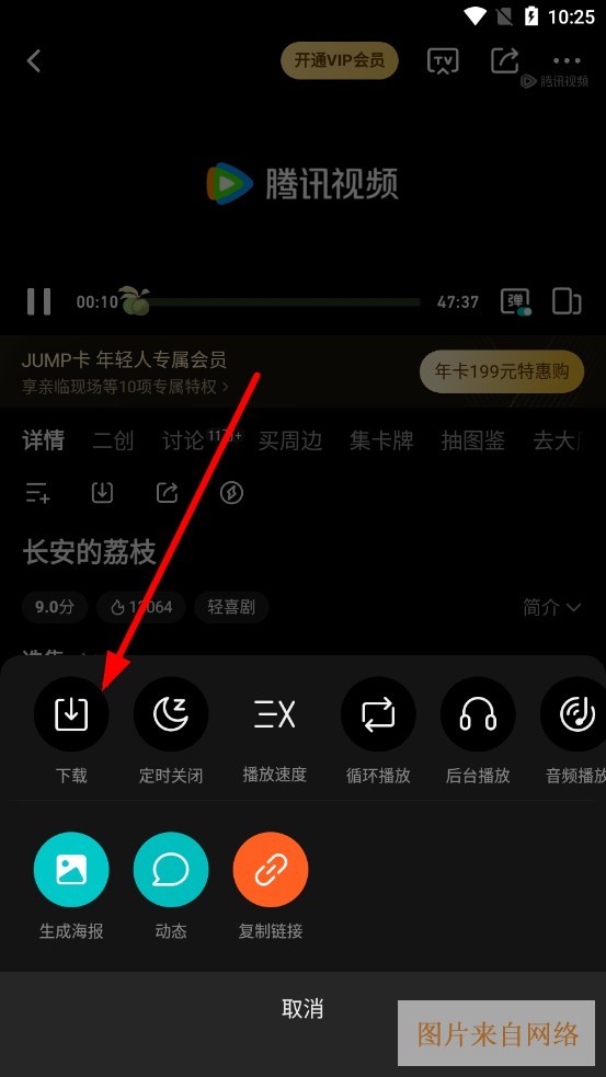3、在弹出的功能菜单中,点击带有向下箭头图标的下载选项,接着选择要下载的集数和清晰度,即可启动缓存流程。