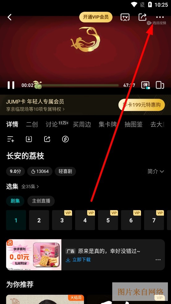 2、进入播放详情页后,在播放进度条上方的右侧区域,点击页面右上角?样式的更多功能按钮。