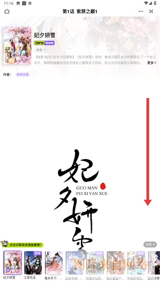 4、进入漫画详情页面内,向下滑动可开始进行观看。