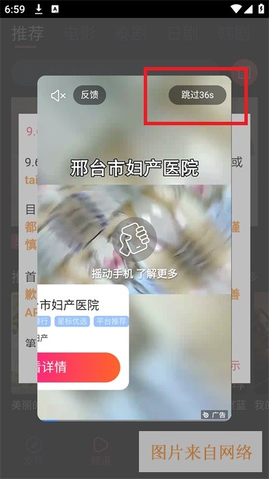 1、确保我们手机上的泰剧兔是正版的软件,然后打开软件进入到首页之中,会看到有一个广告弹窗,不需要等待数秒结束,就可以直接【点击跳过】跳过广告;