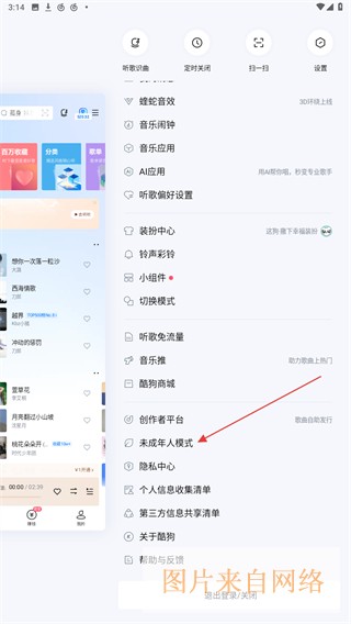 2、在右侧弹出的菜单栏中,点击下方未成年人模式。