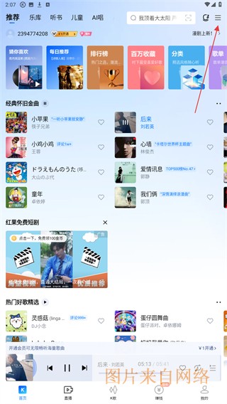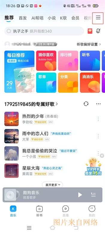 1、启动酷狗音乐APP,进入首页点击右上角三个横线的图标。