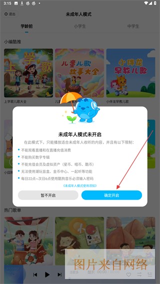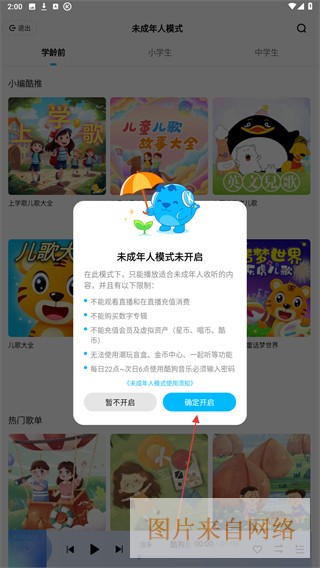 在“青少年模式”下,只能播放适合未成年人收听的内容,并有以下限制: