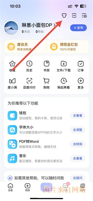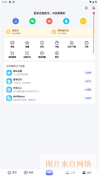 1、打开百度应用,点击右上角的功能菜单按钮。