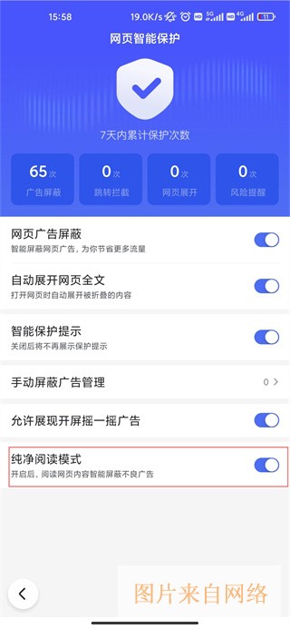 4、勾选【纯净阅读模式】,开启后,阅读网页内容智能屏蔽不良广告