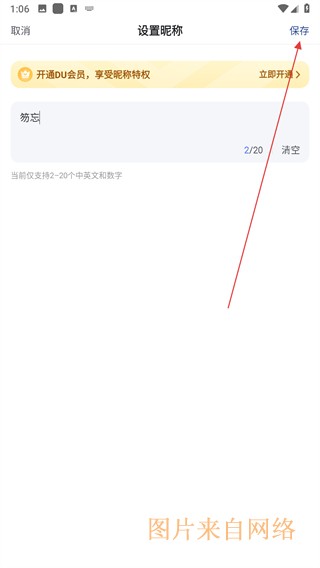 4、在设置昵称页面的输入框中输入新的昵称,点击保存按钮。