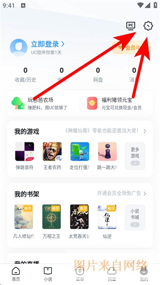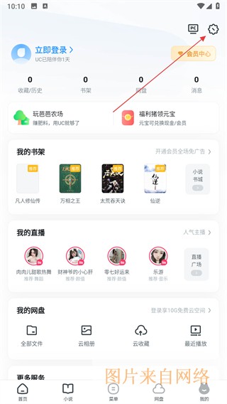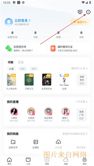 1、打开uc浏览器进入我的页面,找到右上角的设置图标并点击进入更多设置界面。