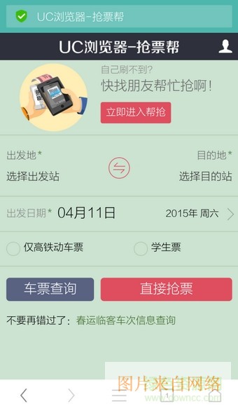 收到了朋友分享的抢票任务后,帮抢者也不用担心会错过了抢票的时间,只要在uc浏览器中添加了帮抢任务,“抢票帮”就会在火车票放票开抢前十分钟推送提醒,告知抢票者可以抢票。抢票开始后,uc抢票专家还会在云端使用上百台高速服务器帮助用户刷票,有效提升成功率。而当任何一个帮抢者抢票成功后,uc浏览器也会第一时间通知需要买票的用户抢票成功,提醒用户尽快支付,并可直接调起用户手机中的支付宝客户端付款,让用户随时随地对火车票进行快速支付,操作便捷,支付也更加安全。