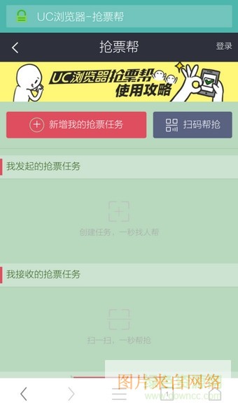 第二步:遇到想买的火车票无票的情况时,除了可以自己进行云端刷票外,还可以通过“抢票帮”创建一个抢票任务。在uc抢票专家的页面顶端进入“抢票帮”帮抢页面,点击“新增我的抢票任务”按钮后将乘车区间、乘车日期、车次类型、车次、席别、乘车人等抢票所需的所有信息都输入这个任务,生成抢票任务。