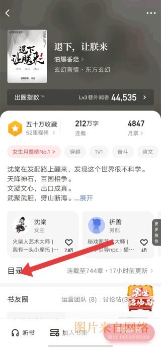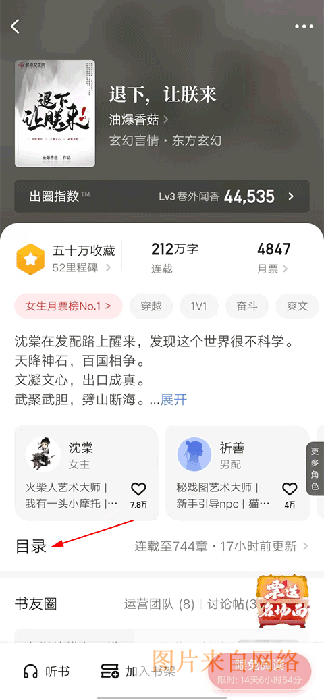 2、小说页面展示书名、作者、分类等信息,出圈指数等数据亮眼,有女主、男配人物介绍目录按钮可查看章节,还设有听书、加入书架等功能。