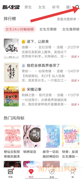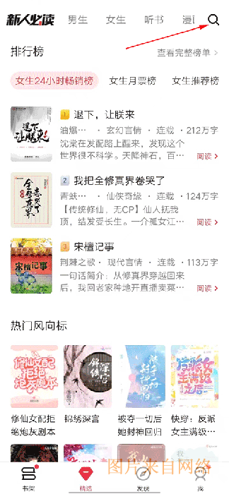 1、精选界面的排行榜区域,有女生24小时畅销榜等榜单,展示热门小说,上方搜索框可查找书籍,热门风向标也推荐诸多小说。