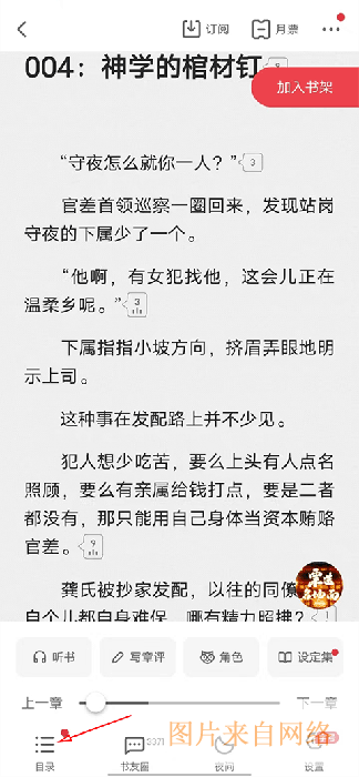 5、如果想看其他章节的内容,点击下屏幕任意位置,底部就会出现选项,点击左下角“目录”。