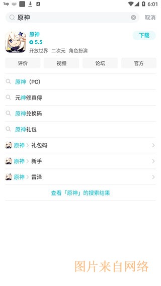 2、其次点击首页中右上方的搜索标志,输入游戏名称,如原神,该游戏的相关信息就会显示出了。