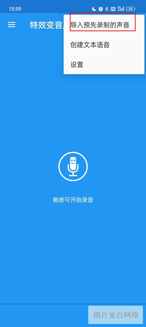 1、在本站下载安装软件之后,点击右上角的功能键位,会弹出很多选项,选择导入预先录制的声音;